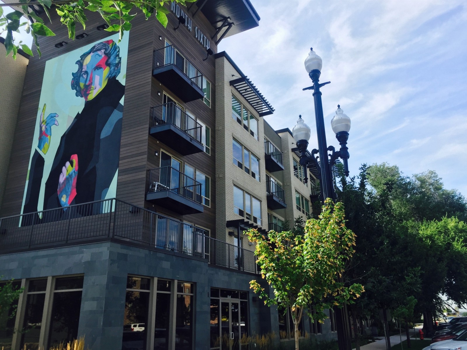 The neighborhood is watched over by a 4-story mural of Thelma McDonald, a woman who cared for the homes along the street for decades. This mural was painted by a local Salt Lake City artist.